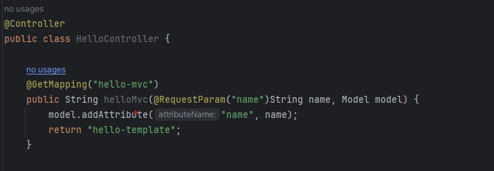 * @RequestParam("name") String name은 /hello-mvc 요청에서 name 파라미터의 값을 name 변수로 받아온다.