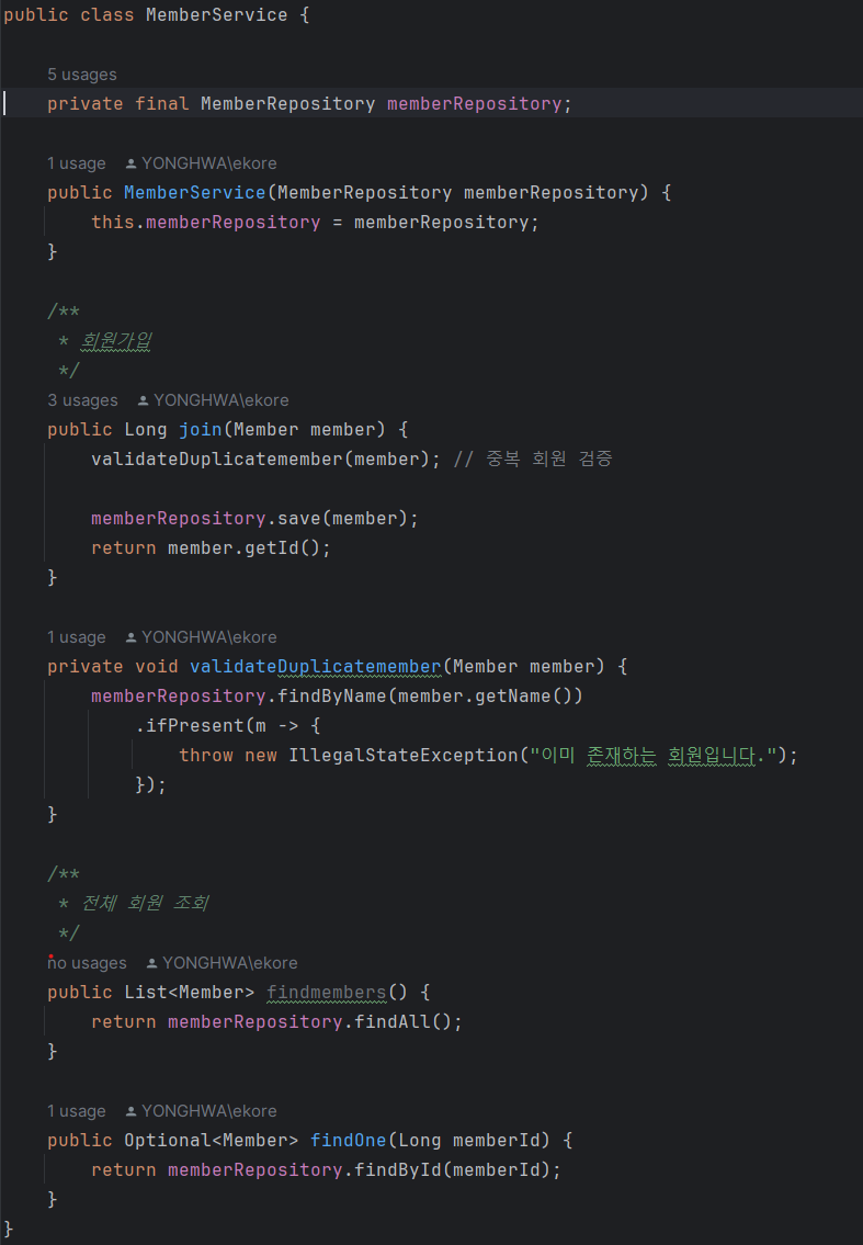 - Service 객체는 Repository를 주입받는다. (Dependency Injection)