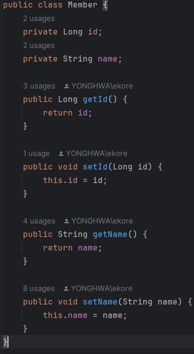 - getter 와 setter를 사용하여 회원정보를 가져온다.