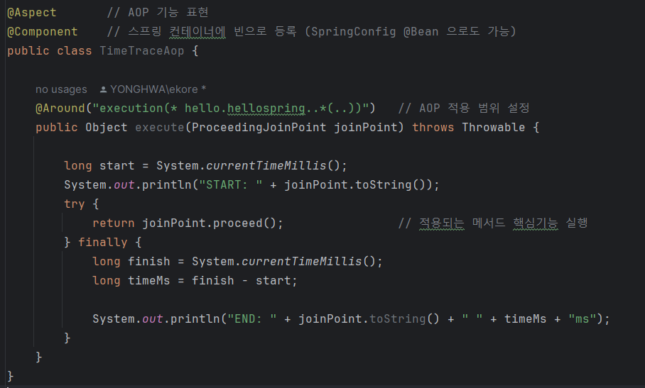 - joinPoint.proceed() : 핵심기능 호출