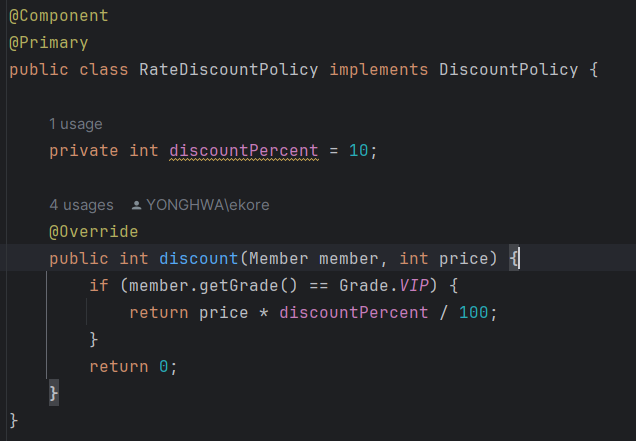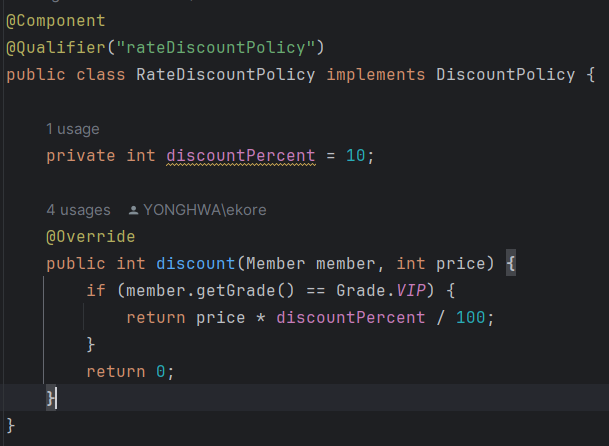 - rateDiscountPolicy 스프링 빈을 찾아서 실행한다.