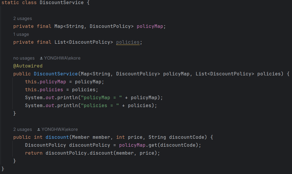 - DiscountService는 Map으로 모든 DiscountPolicy 를 주입받는다. fixDiscountPolicy, rateDiscountPolicy 가 주입된다.