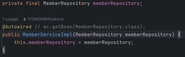 | 필드 주입 | - 테스트 코드 작성 외에는 사용하지 말자! |