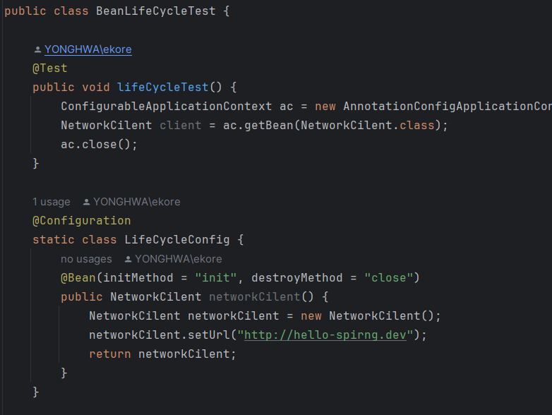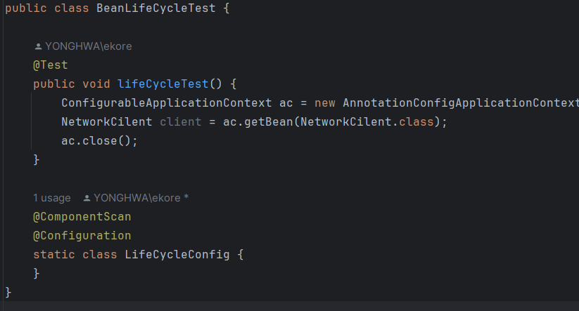 1. lifeCycleTest() 메서드를 실행하면, LifeCycleConfig 설정 정보를 바탕으로 NetworkClient 빈을 생성한다.