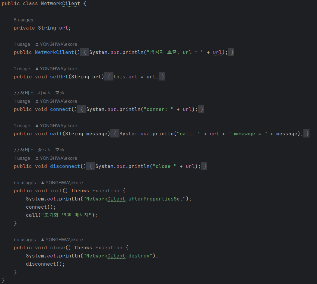 위 코드는 @Bean (initMethod = "[초기화 이후 실행될 메서드]" destroyMethod = "[소멸 직전 실행될 메서드]")