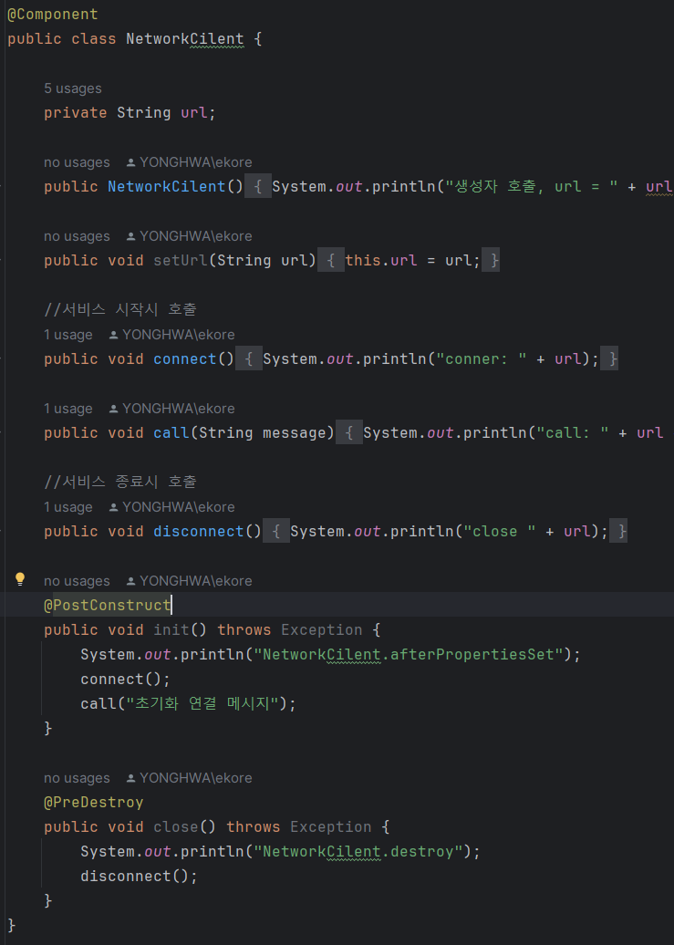 init 메서드와 close 메서드에 각각 @PostConstruct, @PreDestroy 애너테이션을 붙인것이다