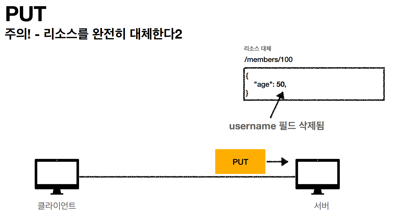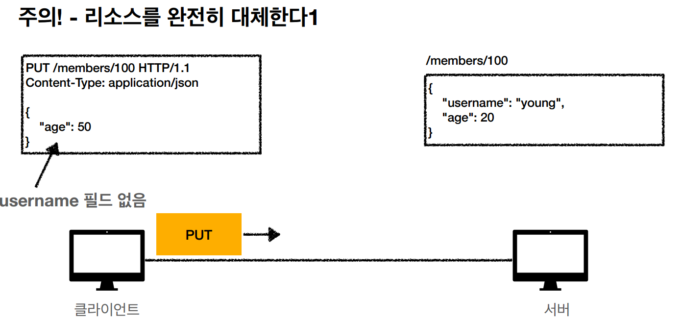 - PUT 메서드는 수정할때 리소스를 완전히 덮어씌워 버린다.