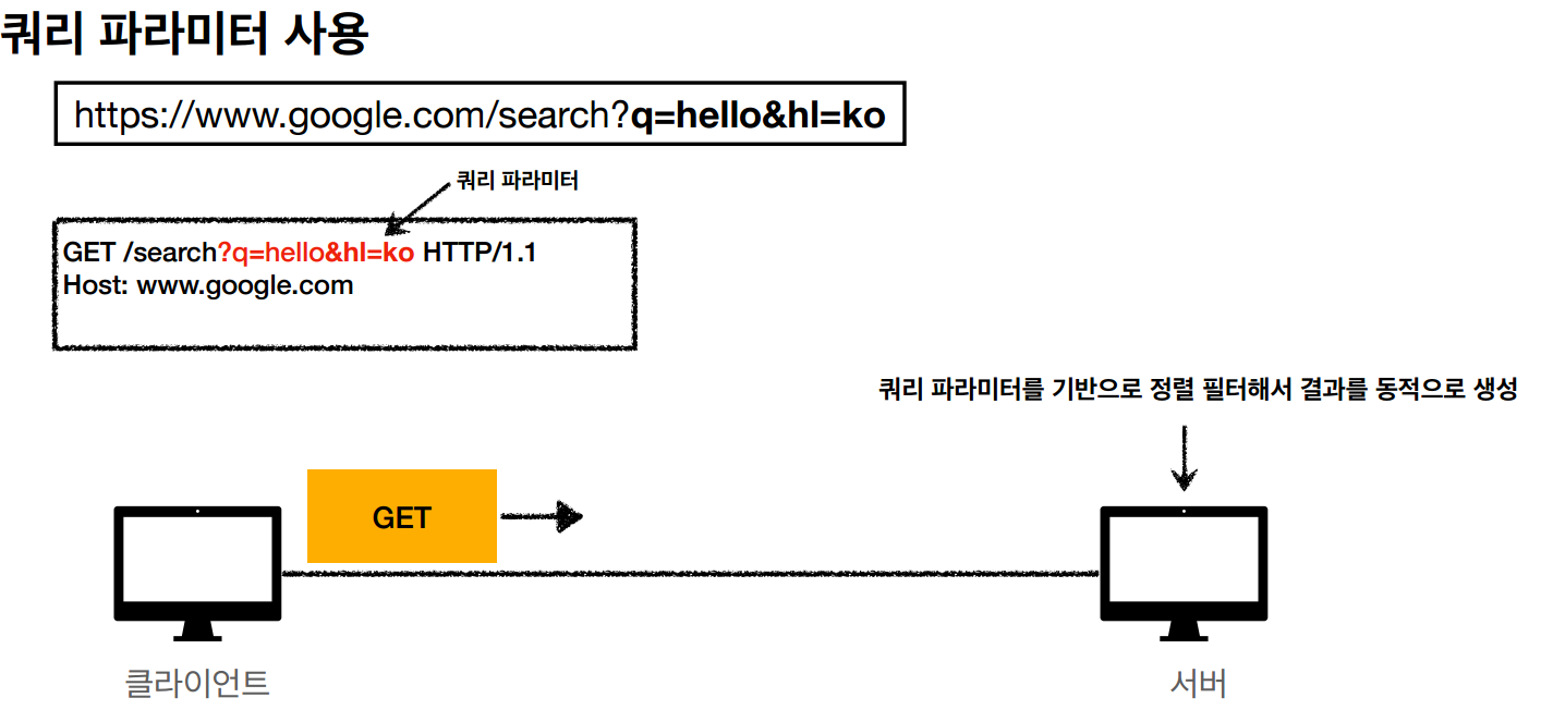 - 검색이나 정렬조건에 의한 정렬 등 '쿼리 파라미터'를 사용하여 데이터 전달하고 동적 데이터를 조회한다.