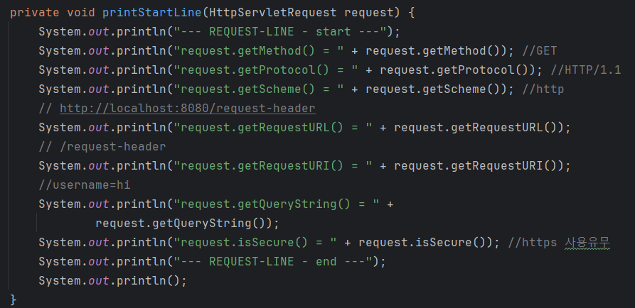 이런 식으로 Http 요청 메시지의 가장 첫 줄인 StarLine에 표기되는 정보를 쉽게 가져올 수 있다.