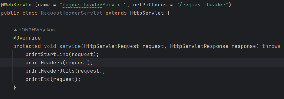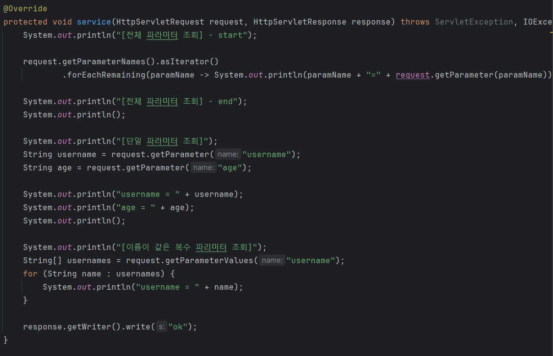HttpServletRequest 객체는 요청메시지의 정보를 쉽게 꺼내올 수 있는 메서드를 지원한다.