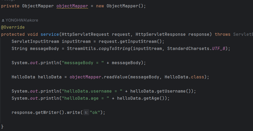 이를 위해 ObjectMapper 클래스를 사용한다. JSON 데이터를 가져올때는 ServletInputStream 으로 가져온다음
