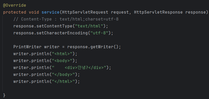 HTML 생성을 위해 ContentType : "text/html" 로 설정해준다. 추가로 인코딩 정보도 utf-8로 설정한다.