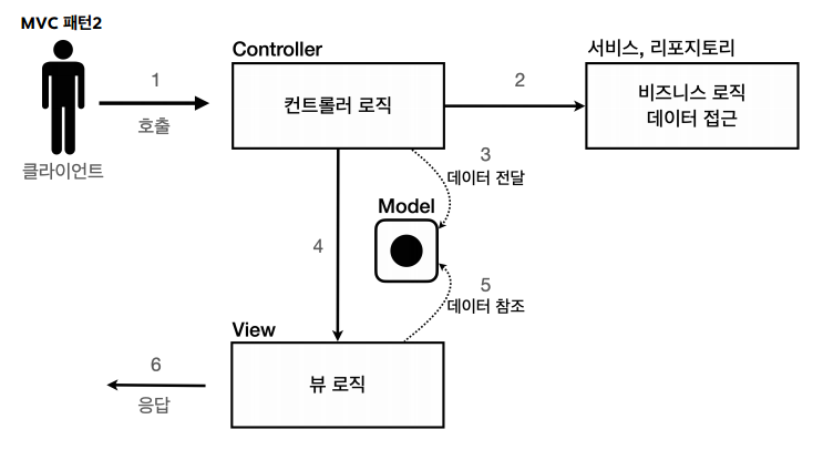(Model 의 역할은 Request 객체가 수행하고 있다. Model은 컨트롤러가 View에 정보 전달할때 사용된다)