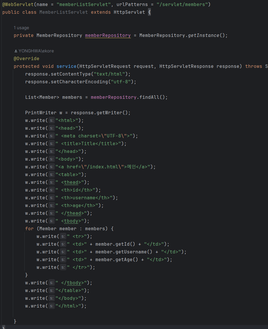 Servlet 만으로 웹개발을 하던 초기에는 이런 식의 코드가 작성되었다.