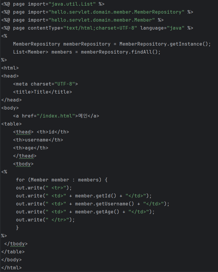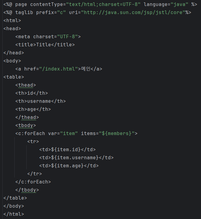 복잡한 자바코드는 사라지고 Request 객체를 통해 전달된 members를 ${members} 를 사용하여 꺼내고