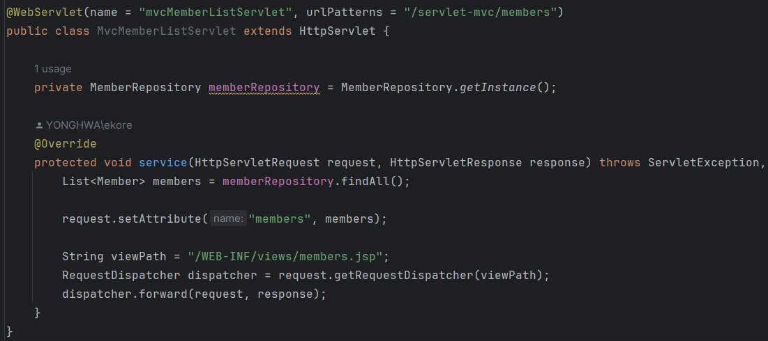 Servlet 과 JSP에서 봤던 회원목록 조회 로직을 MVC 패턴으로 리팩토링한 코드 중 Controller 코드다.