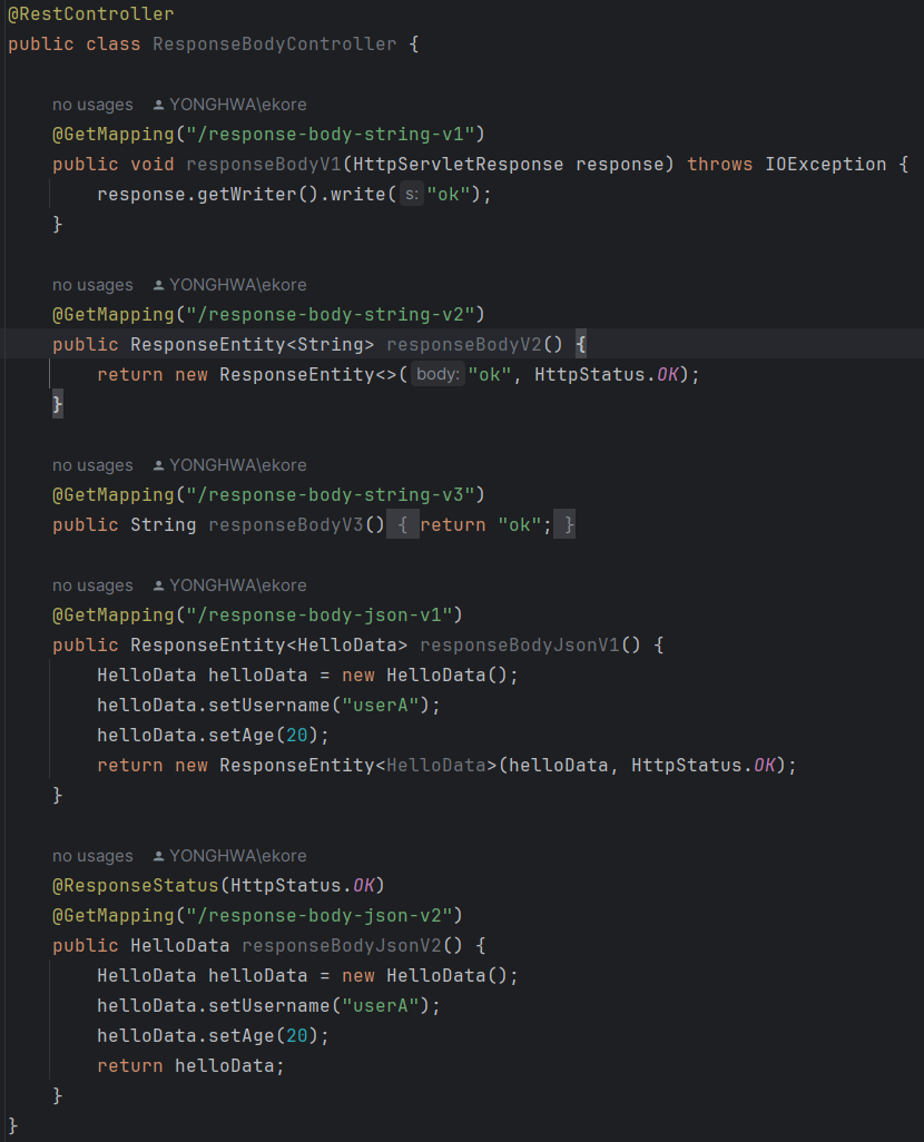 HttpEntity와 차이점은 HTTP 상태코드를 동적으로 작성할 수 없다는 점 (@RequestStatus)과