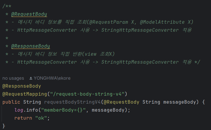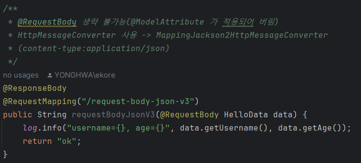 @RequesBody 애너테이션을 사용하면, HttpEntity 객체와 마찬가지로, HttpMessageConverter 가 사용된다.