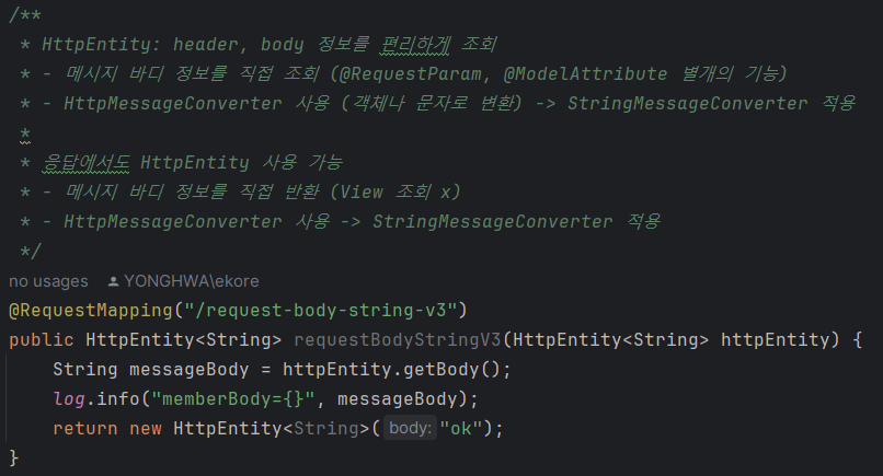 HttpEntity 객체는 HTTP 바디 정보를 가져올때, HTTP 응답 메시지에 바디 정보를 입력할때 둘다 사용할 수 있다.