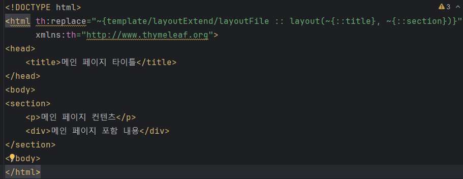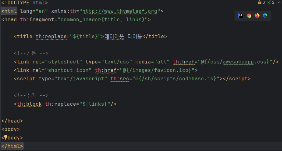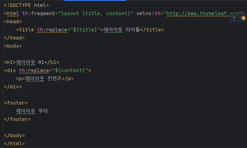<html> 에 th:fragment 속성이 정의되어 있다. 이 레이아웃 파일을 기본으로 하고