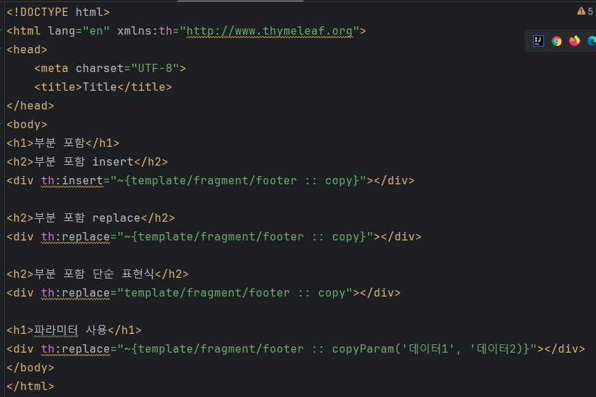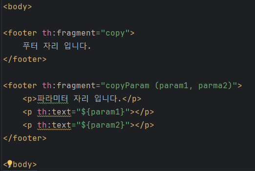 파라미터가 필요한 경우에는 th:fragment = "호출명 (파라미터)" 형식으로 설정 해줄 수 도 있다.