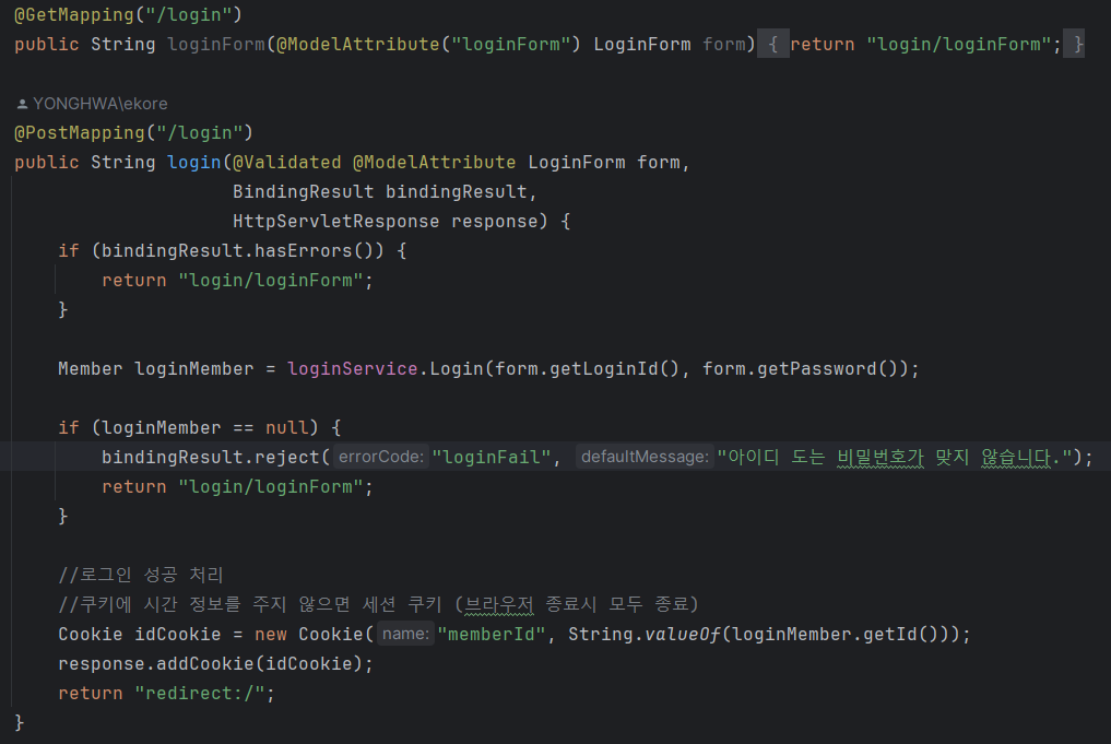 로그인을 담당하는 메서드 login 을 살펴보자 로그인이 성공한 경우 쿠키를 생성하고 HttpServletResponse 객체에