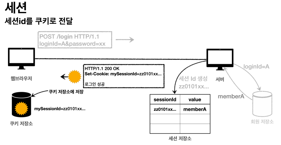 서버는 클라이언트에 mySessionId 라는 이름으로 세션ID 만 쿠키에 담아서 전달한다.