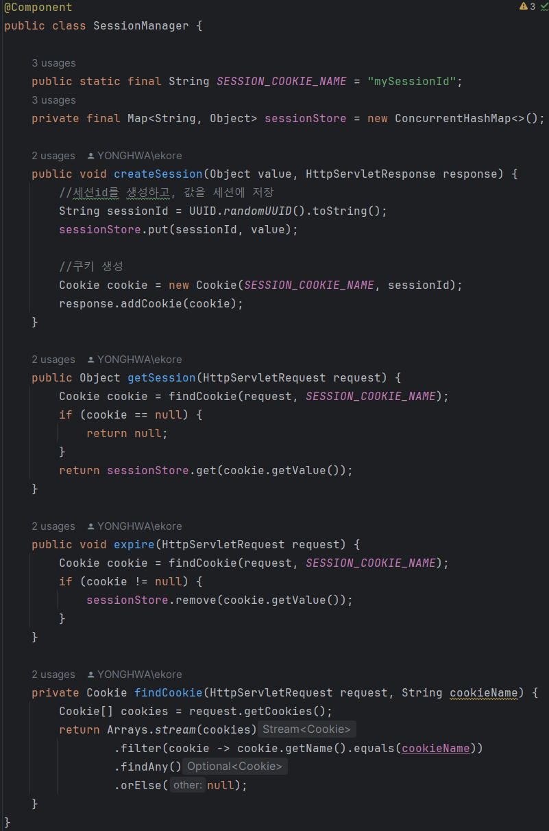 3. 세션 만료 (expire) : 요청에서 쿠키를 조회한뒤, 세션에서 객체를 지운다.