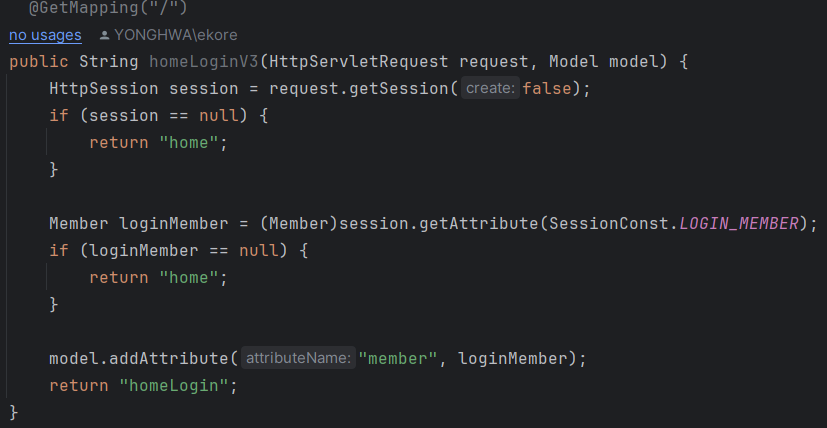 getSession(false) 를통해 null이 올 수 도 있다. null이 오면 일반 홈페이지, 세션에 저장된 값이 있고