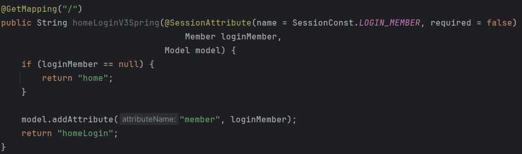 @SessionAttribute (name = 'key값', required = true/false) 로 더 편리하게 세션값을 확인할 수 있다.
