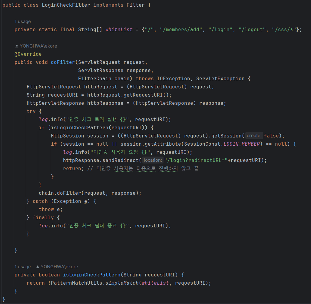 이제 서블릿 필터를 이용하여 로그인 인증을 확인하는 코드를통해 확인해보자
