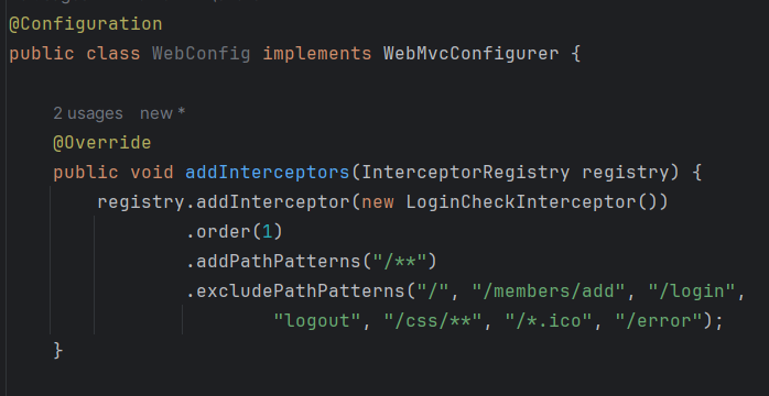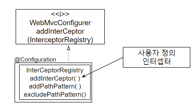 WebMvcConfigurer 인터페이스의 addInterceptors 메서드를 구현한다. 이때 인자로 전달된