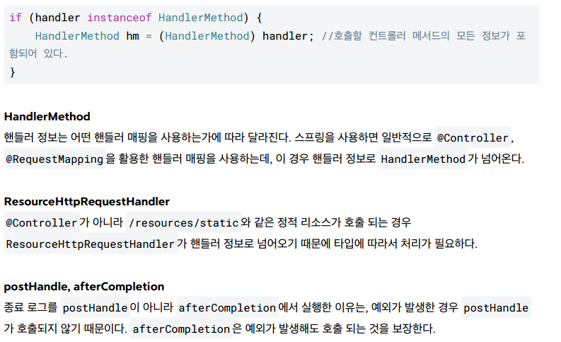 핸들러에서 예외가 발생한 경우 postHandler 는 실행되지 않지만, afterCompletion은 항상 실행된다.