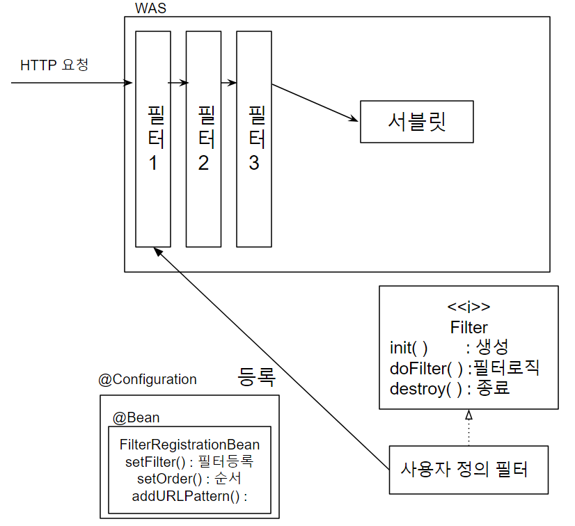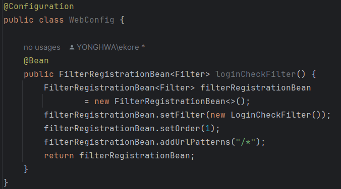 필터를 등록할때는 @Configuration 애너테이션을 사용한 클래스에서 FilterRegistrationBean 객체를 사용한다