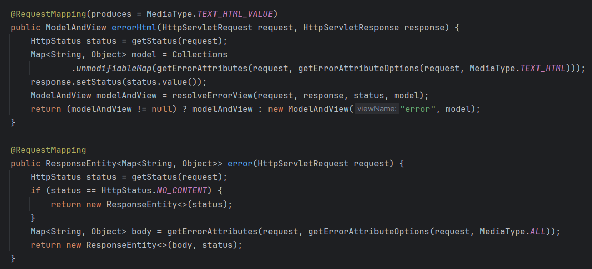 BasicErrorController 에서도 @Request(produces) 속성을 사용하여 HTML 요청과 API 요청에 대응하도록 되어있다.