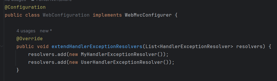 WebMvcConfigurer 를 구현한 @Configuration 클래스에서 extendHandlerExceptionResolver( ) 메서드를 작성한다.
