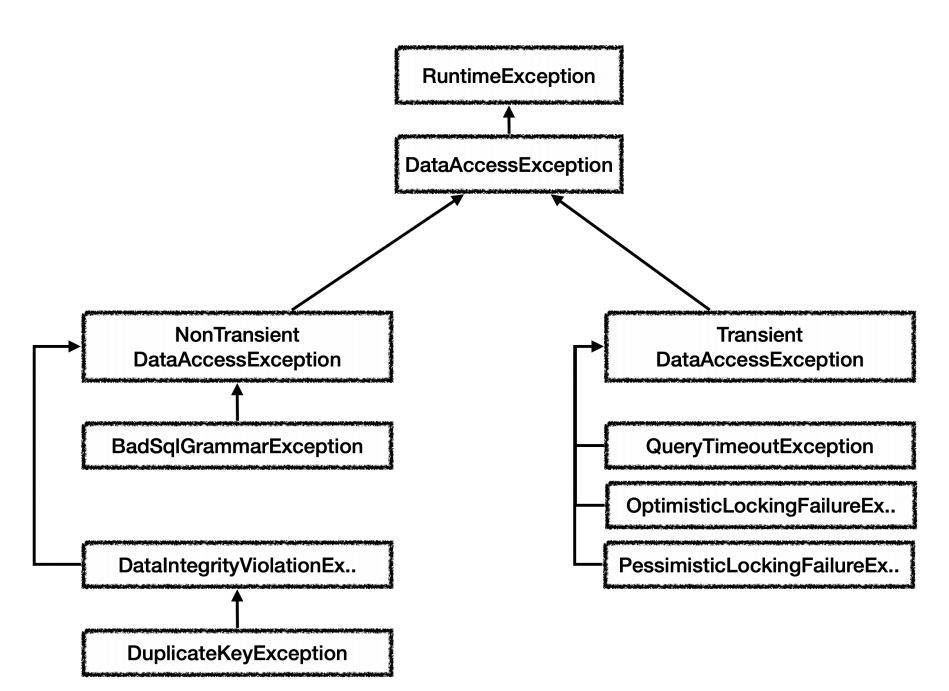 이 문제를 예방하기 위해 스프링에서는 예외 추상화 하여 제공한다.
