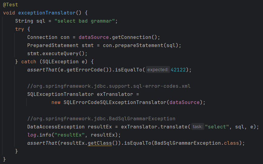 반환 타입은 최상위 타입인 DataAccessException 이지만 실제로는BadSqlGrammarException 예외가 반환된다.
