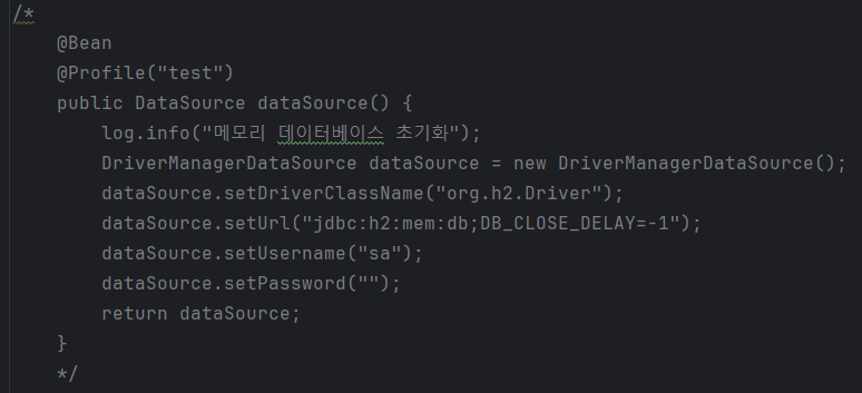 DataSource 빈 생성 코드를 모두 주석처리하고 테스트를 실행해보자