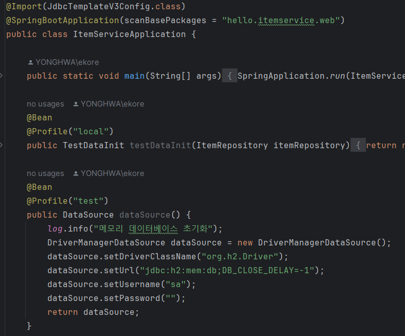 그리고 Application 클래스에서 test 프로필 실행시, DataSource 빈으로 내부 h2 DB 를 생성하도록 정보를 설정한다.