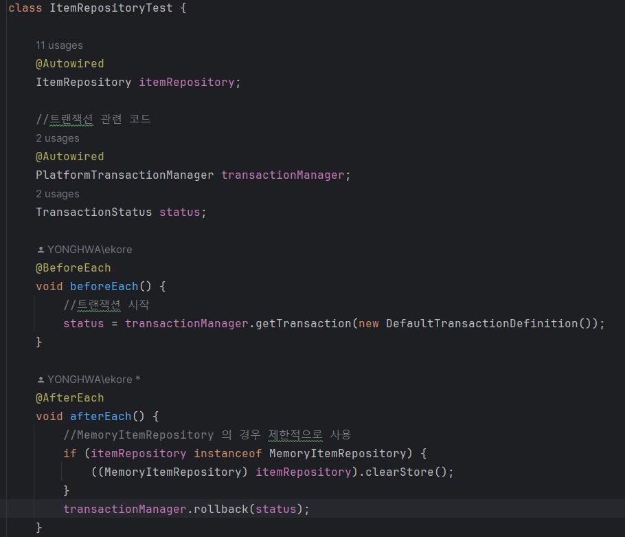 먼저 이렇게 트랜잭션 매니저를 테스트 코드에서 직접 사용하는 방법이 있을 것이다.