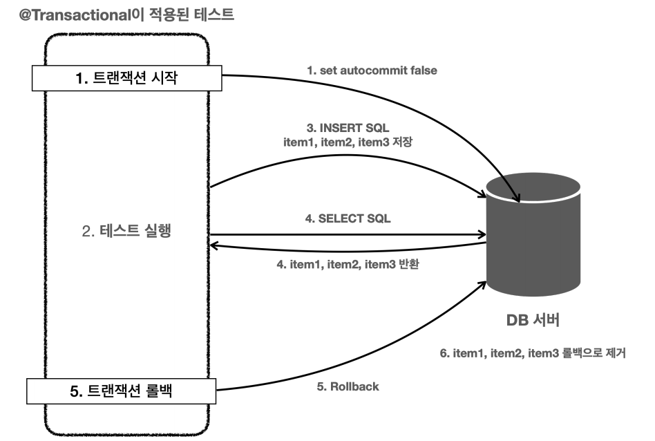 @Transactional 애너테이션은 테스트에서 사용하면, 테스트가 끝날때 자동으로 롤백을 실행한다.