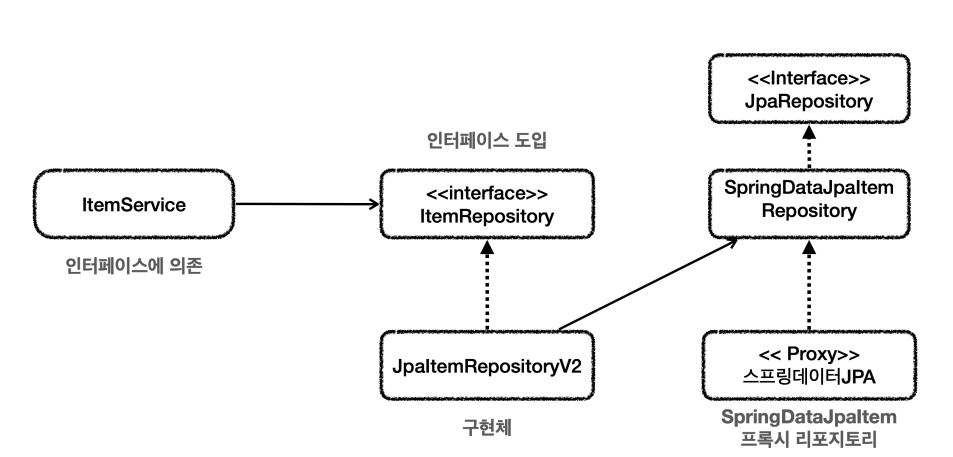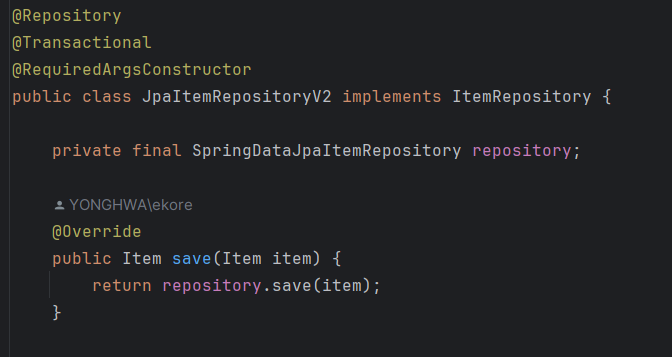 1. 기존의 서비스 객체에서 ItemRepository 인터페이스에 의존하므로, JpaRepositoryV2는 ItemRepository 를 구현한다.