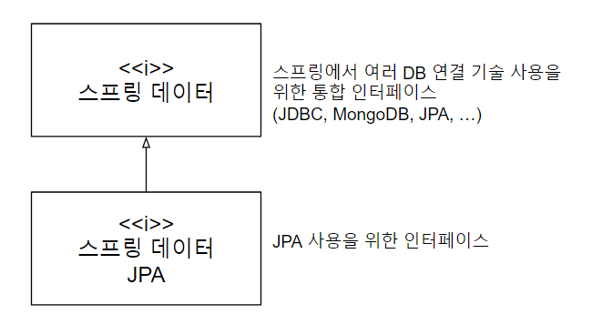 스프링은 특정 DB 기술에 의존하지 않기 위해 여러 DB 기술(JDBC, JPA, ...)을 통합하는 스프링데이터 인터페이스를 제공한다. 그 하위 인터페이스에 JPA 사용을 편리하게 해주는 스프링 데이터 JPA 인터페이스가 있다.