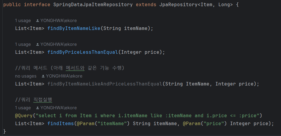 3. findByItemNameLikeAndPriceLessThanEqual 메서드와 findItems 는 같은 역할을 한다.