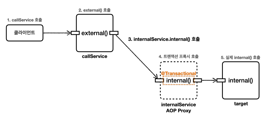 5. 트랜잭션 적용 후 실제 internalService 객체 인스턴스의 internal() 을 호출한다.
