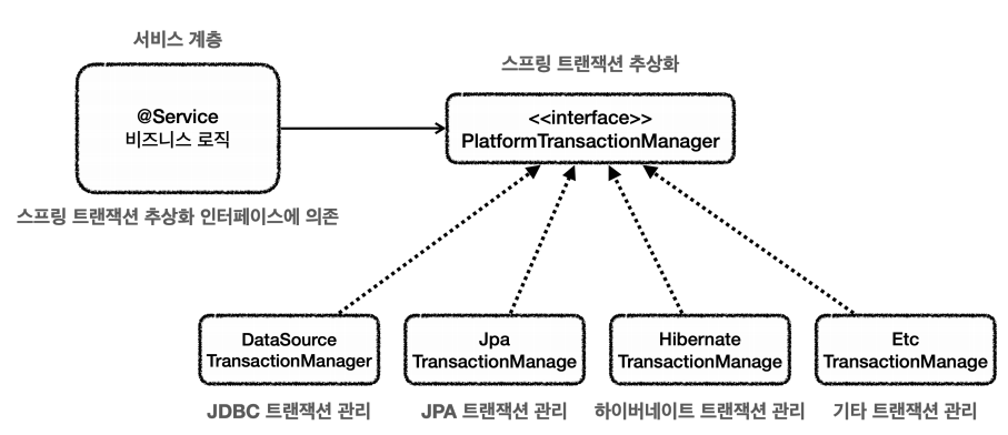 그래서 스프링은 트랜잭션 기능을 추상화(PlatformTransactionManager)하여 제공하고 기술별 구현체도 제공한다.