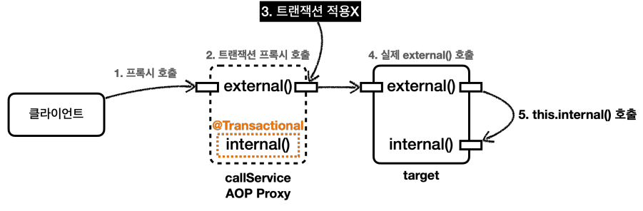 트랜잭션이 걸린 internal 메서드를 내부호출하고 있다. 이 경우 internal 메서드의 트랜잭션이 실행되지 않는다.
