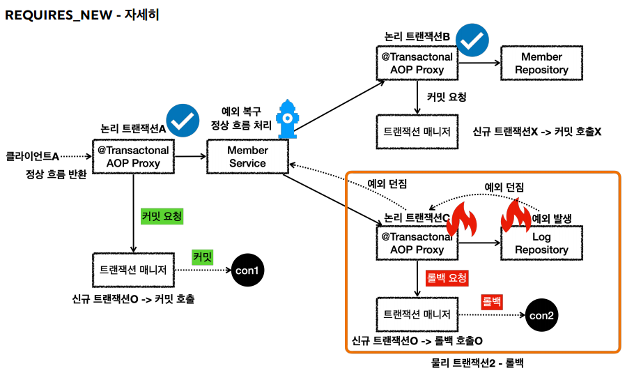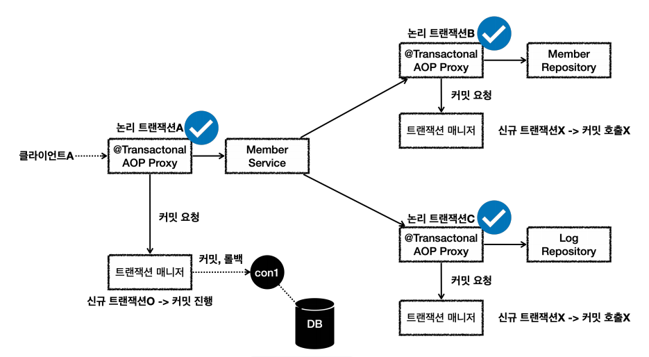 4. 내부 트랜잭션인 MemberRepository와 LogicRepository 는 커밋상황에서도 신규트랜잭션이 아니므로, 커밋을 호출하지 않는다.