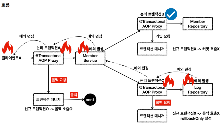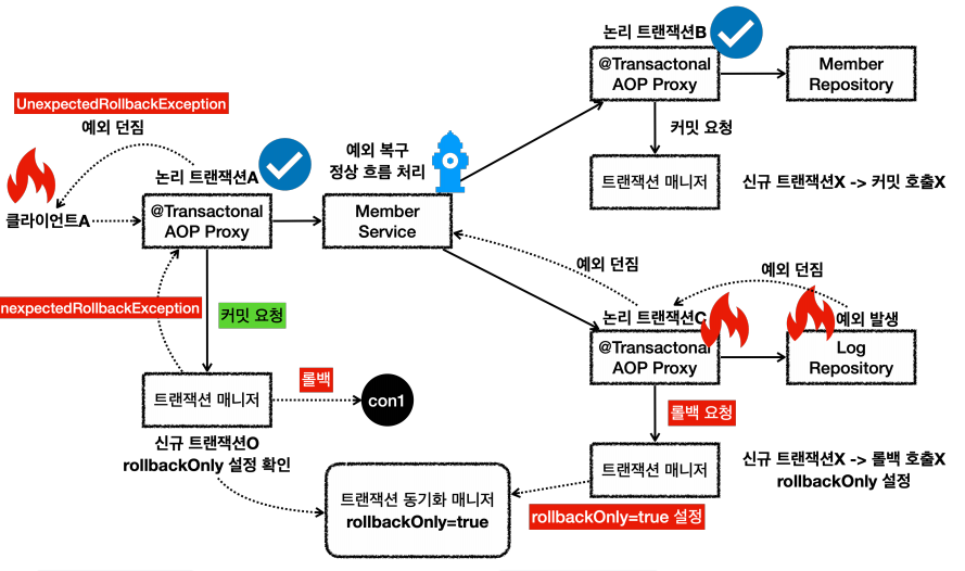 3. rollbackOnly 설정이 있으므로, 롤백을 실행하고, MemberRepository, LogRepository 모두 롤백된다.